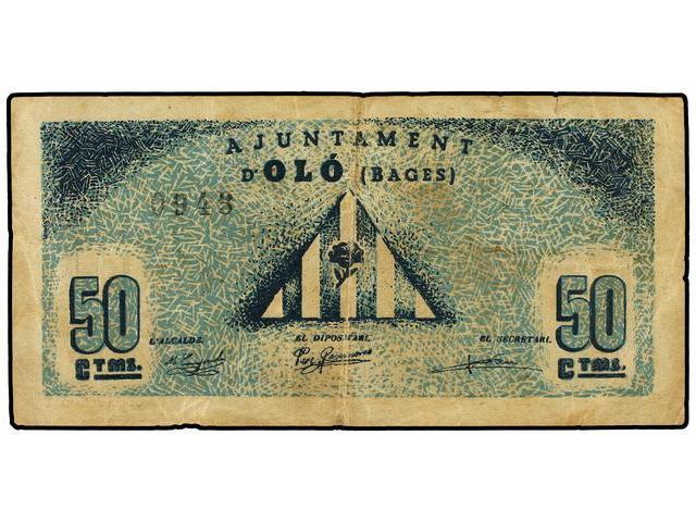 Lote 2 billetes 50 Cèntims y 1 Pesseta. S/F. Aj. d´OLÓ. (El de 1 pta. reparado con cinta adhesiva y el de 50 cts. pequeñas roturas). AT-1691a y 1692a; T-1940a y 1941a. MBC+.
