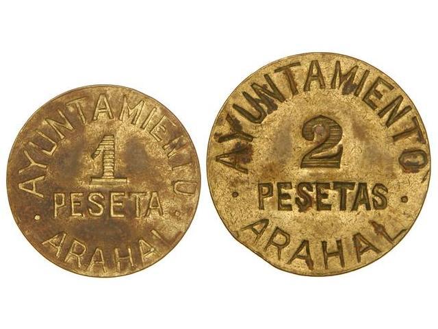 Lote 2 monedas 1 y 2 Pesetas. S/F. Ay. de ARAHAL. Latón. Vti-L44/L45. MBC+.