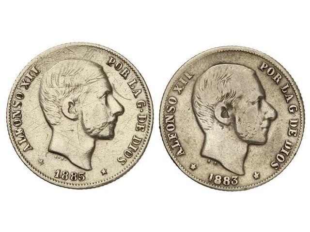Lote 2 monedas 20 Centavos de Peso. 1883 y 1885. MANILA. (Múltiples rayas y pequeños golpecitos). MBC- a MBC.