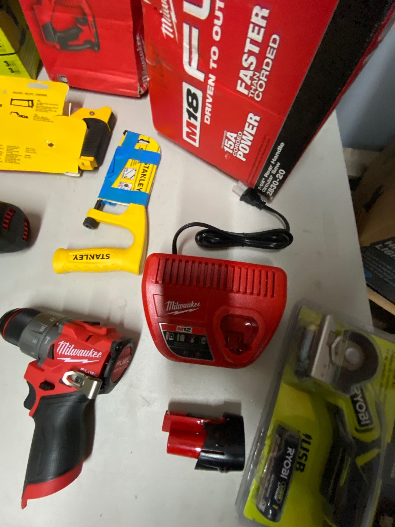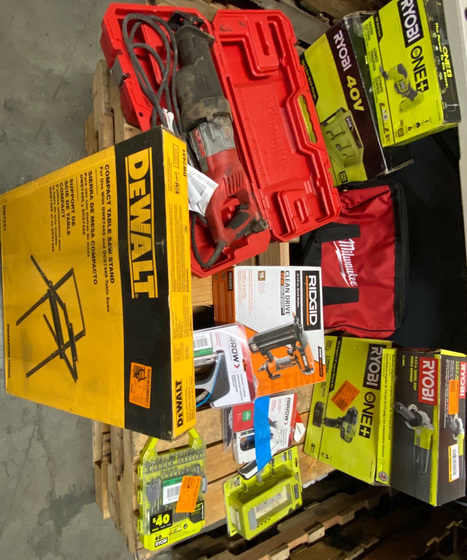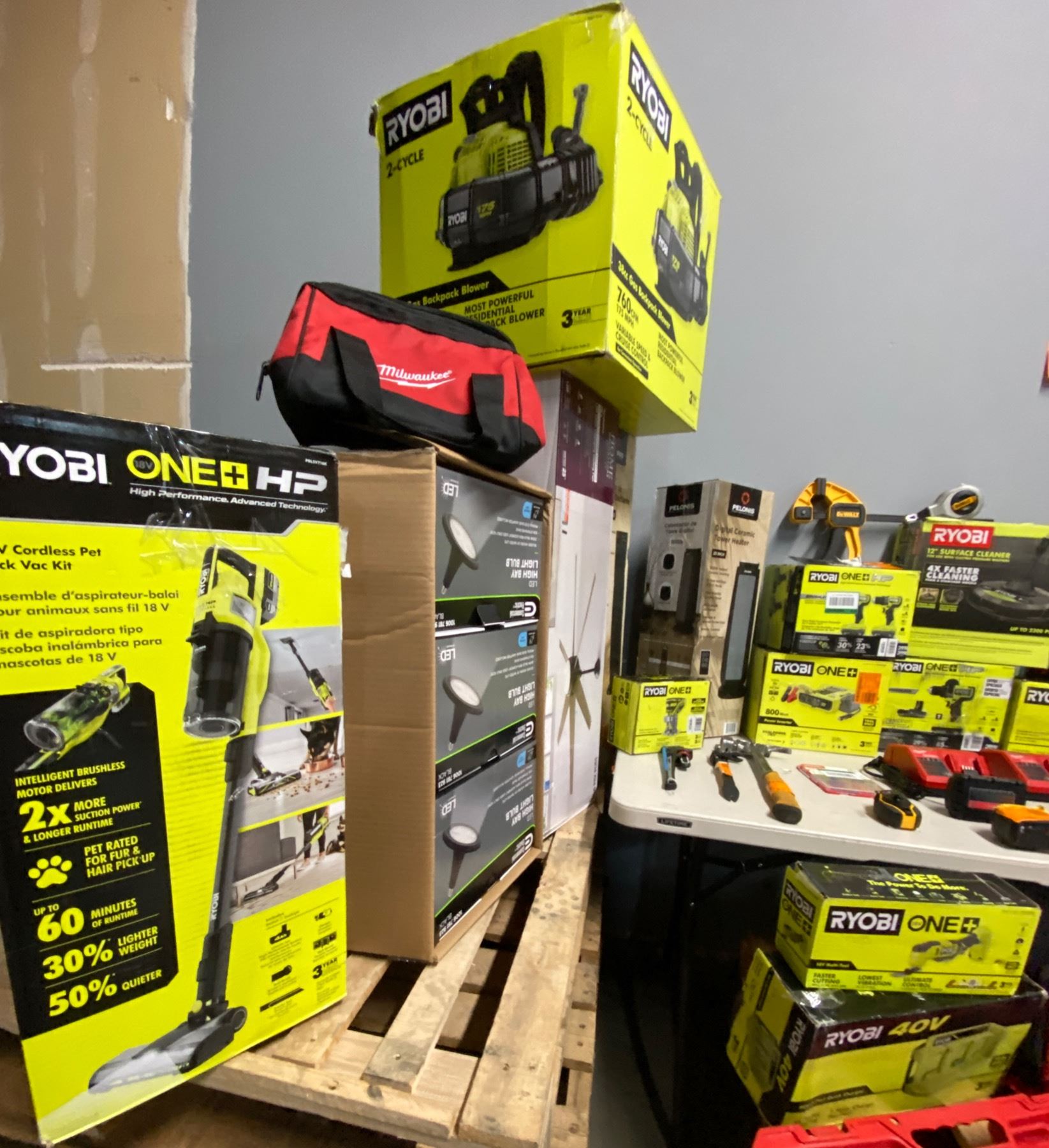 Lote de Herramienta y Home Improvements de la tienda Home Depot. Lote te incluye sopladora de mochila Ryobi, focos para hogar, aspiradora Ryobi, multitool Ryobi, taladros Milwaukee, mesa para sierra Dewalt, Skilsaw Milwaukee, suéter con calefacción Milwaukee, calentones, sawzall Milwaukee, batearías de marcas Dewalt y Milwaukee, taldadros Ryobi, roto martillo Ryobi, y mucho mas.
