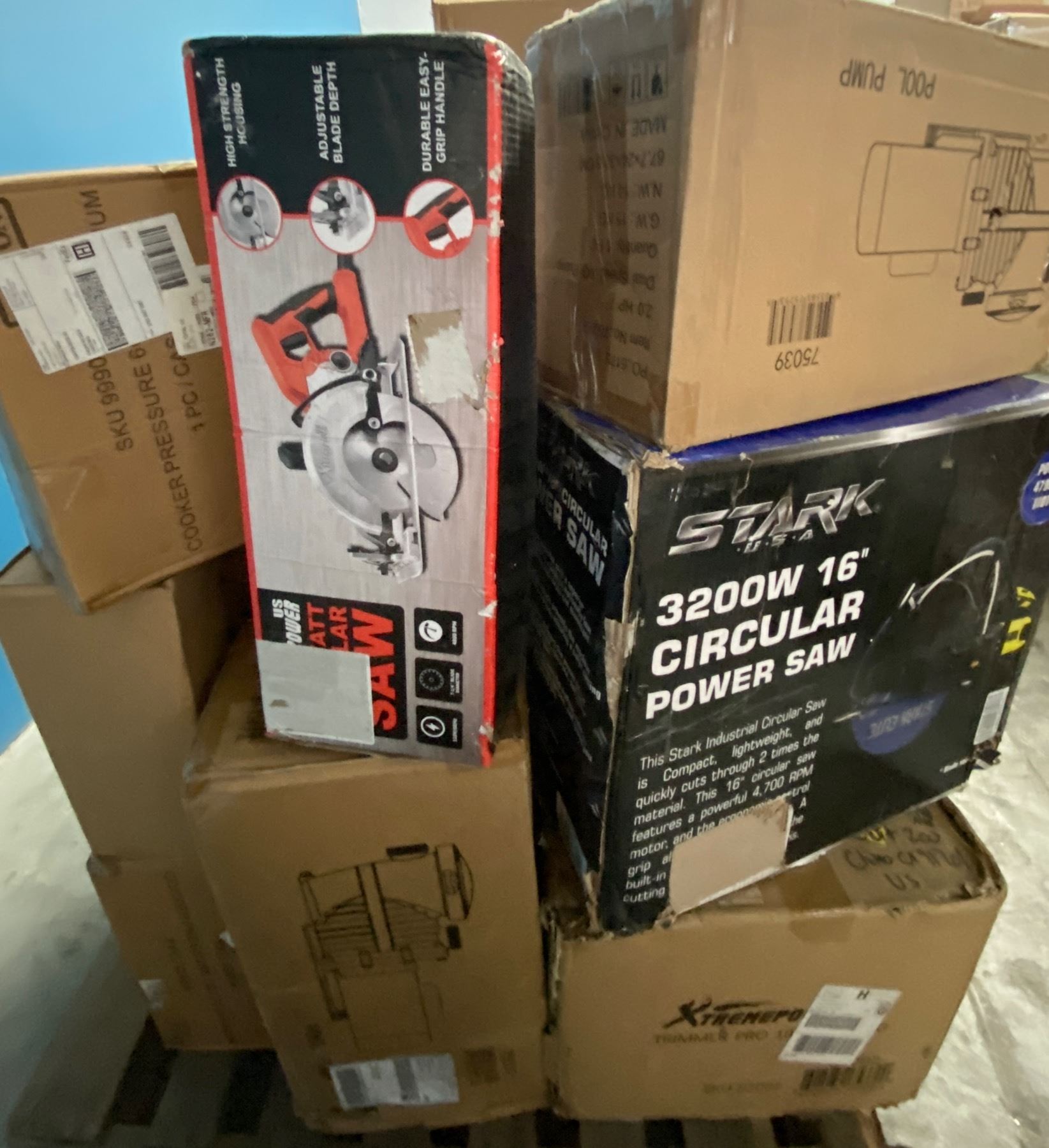 Pallet de Herramienta y Home Improvements de la tienda Home Depot. Lote incluye power saw, stove burner, cooker pressure, power sweeper, deck box, y mucho mas.