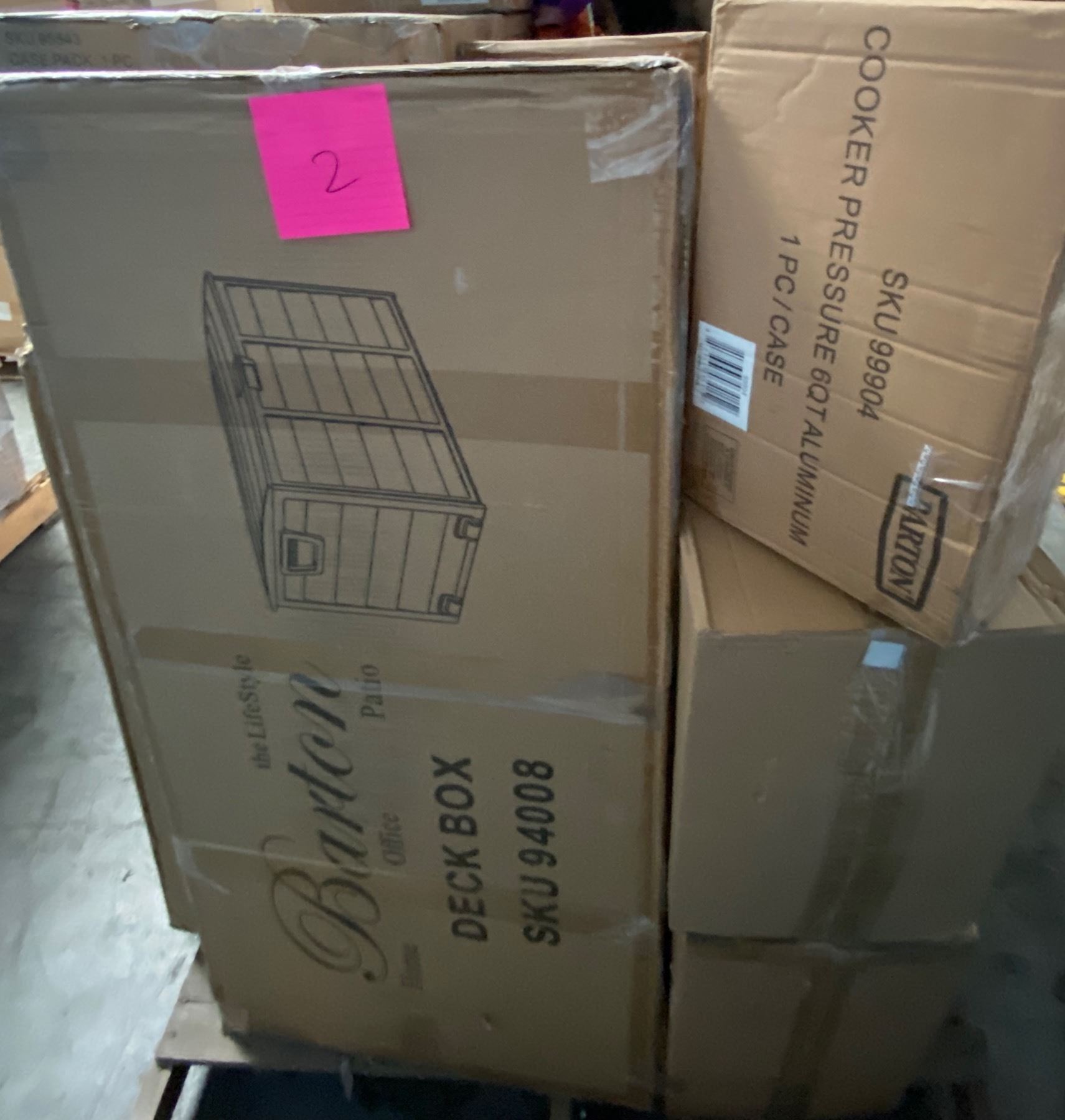 Pallet de Herramienta y Home Improvements de la tienda Home Depot. Lote incluye power saw, stove burner, cooker pressure, power sweeper, deck box, y mucho mas.
