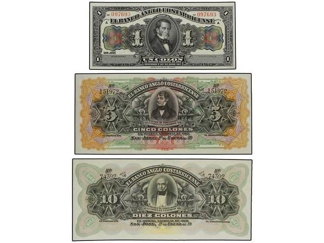 Lote 3 billetes 1, 5 y 10 Colones. 1917 y S/F. COSTA RICA. WPM-S121s1,S122a y S123r. SC.