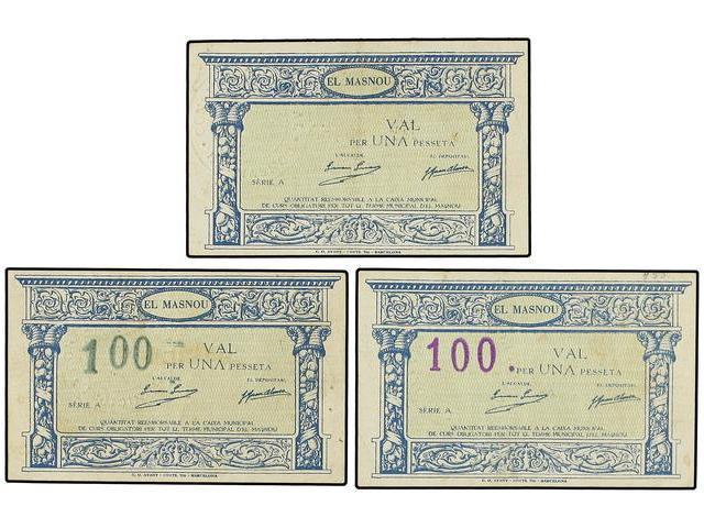 Lote 3 billetes 1 Pesseta. Aj. de EL MASNOU. Normal. Con tampón 100 en violeta y gris verde. AT-1466,1466b, 1466d; T-1672, 1672b, 1672d. MBC+ a EBC-.