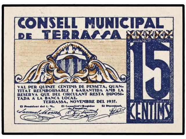 Lote 3 billetes 10, 15 y 50 Cèntims. 21 Maig 1937 y 15 Novembre 1937. C.M. de TERRASSA. AT-2457, 2458 y 2459a; T-2848, 2849 y 2850a. MBC- a SC.