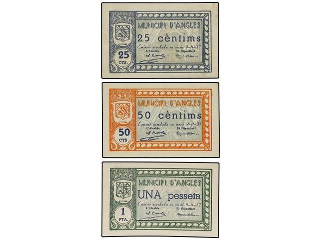 Lote 3 billetes 25, 50 Cèntims y 1 Pesseta. 9 Novembre 1937. Municipi d´ANGLÈS. AT-161/163. EBC+a SC.