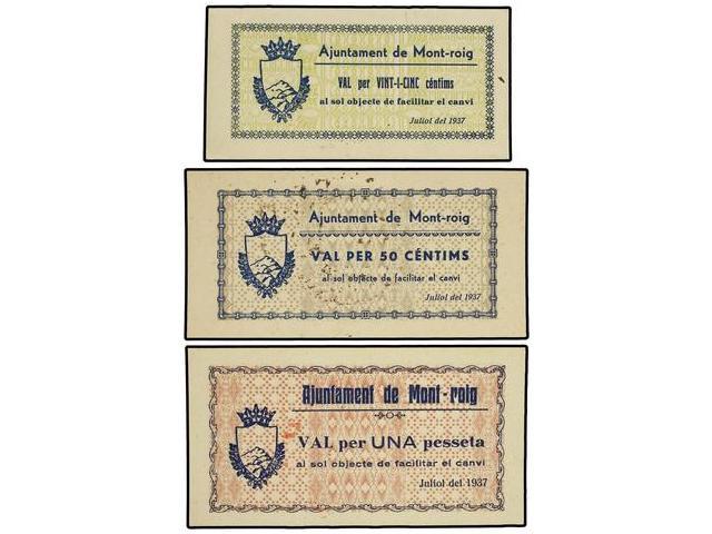 Lote 3 billetes 25, 50 Cèntims y 1 Pesseta. Juliol 1937. Aj. de MONT-ROIG. AT-1600/02. SC.