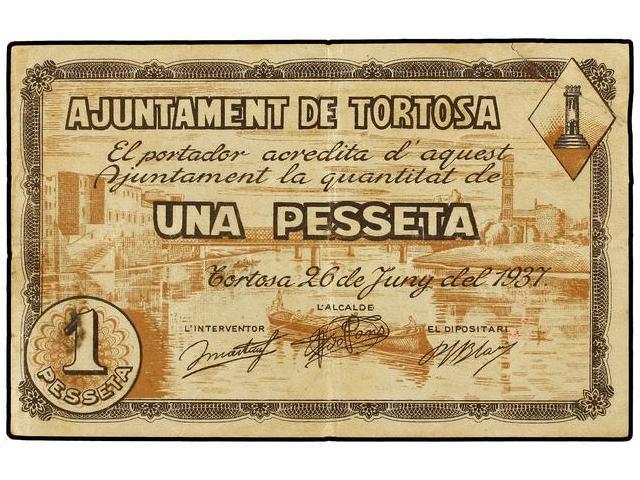 Lote 3 billetes 50 Cèntims (2) y 1 Pesseta. 26 Juny 1937. Aj. de TORTOSA. (El de 1 Pesseta, reparación con adhesivo). AT-2578, 2579; T-2996, 2997. MBC- a MBC.