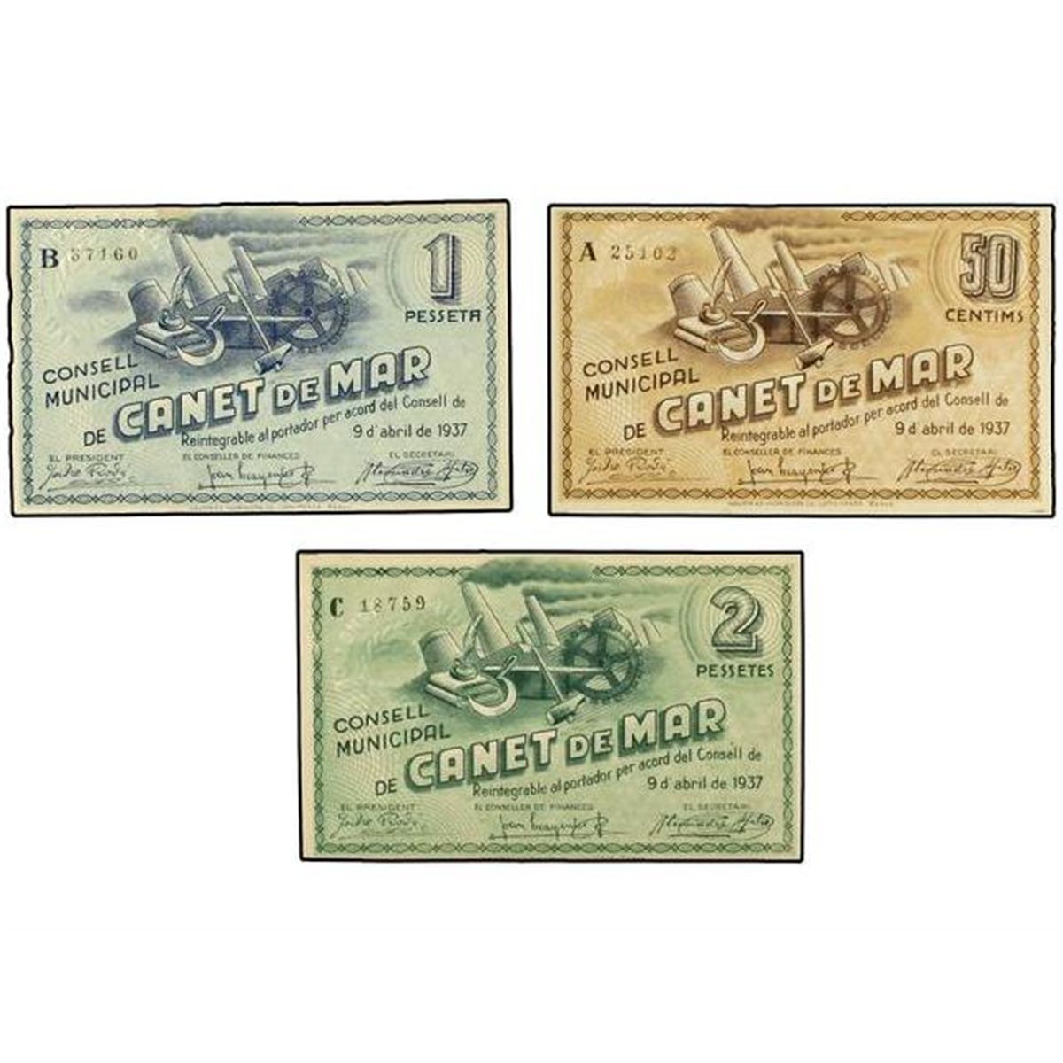 Lote 3 billets 50 Cèntims, 1 i 2 Pessetes. - 9 abril 1937. - C.M. de CANET DE MAR. - AT-637/39; T-741/43. EBC+. - -