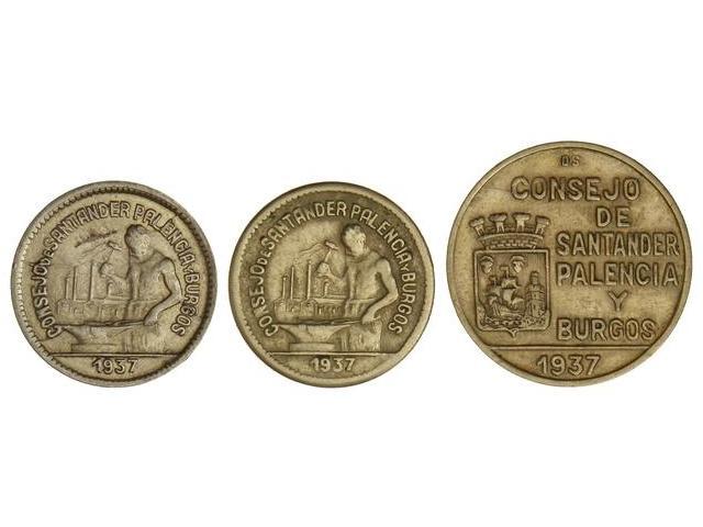 Lote 3 monedas 50 Céntimos (2) y 1 Peseta. - C. de PALENCIA, SANTANDER y BURGOS. - CuNi. Una de 50 Céntimos con contramarca P.J.R. MBC+. - -