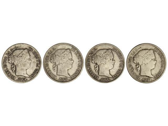 Lote 4 monedas 40 Céntimos de Escudo. 1864, 1865, 1866 y 1867. MADRID. (La de 1864 pulida). A EXAMINAR. Cal-336/339. BC+ a MBC-.
