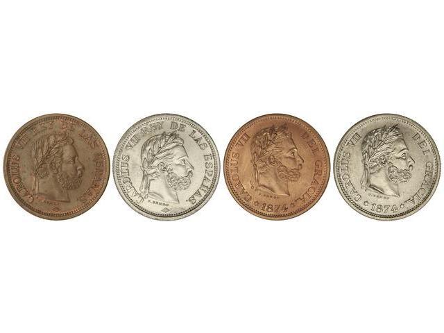 Lote 4 reproducciones 5 Pesetas. 1874. (BRUSELAS). AE (2) y AR (2). Dos con fecha en anverso Cal-Tipo 1 (AR) y Cal-Tipo 3 (AE). Dos con fecha en reverso Cal-Tipo 2 (AR y AE). Todas con canto estriado. SC.