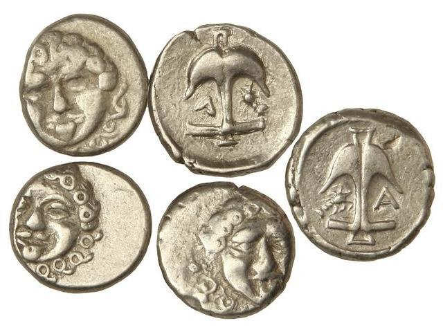 Lote 5 Dracmas. 450-400 a.C. APOLLONIA PONTICA. TRACIA. Anv.: Medusa. Rev.: Ancla. AR. A EXAMINAR. Se-160. MBC- a MBC+.