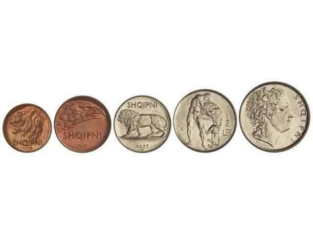 Lote 5 monedas 5, 10, Qindar Leku, 1/4, 1/2 y 1 Lek. - 1926 y 1927. - Br., Ni. KM-1, 2, 3, 4, 5. SC. - -