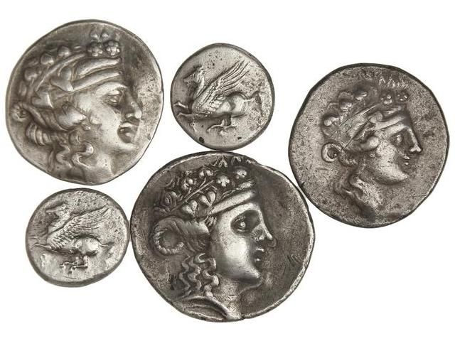 Lote 5 monedas Estátera (2) y Tetradracma (3). THASOS y CORINTO. A EXAMINAR. MBC- a MBC+.
