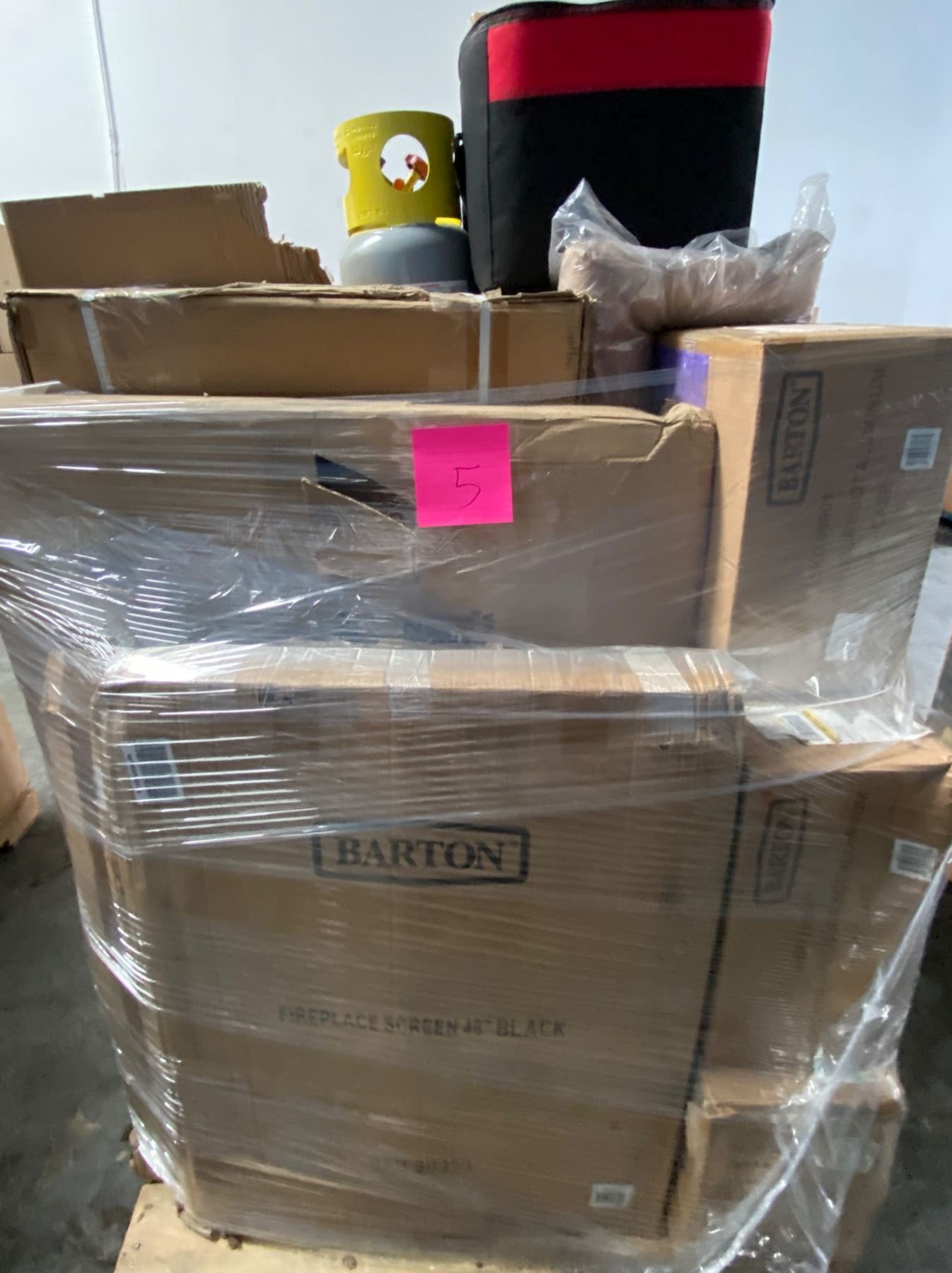Pallet de Herramienta y Home Improvements de la tienda Home Depot. Lote incluye una mina, screen de 48" para alumbrada, muebles de exterior, pompa para alberca, y mucho mas.