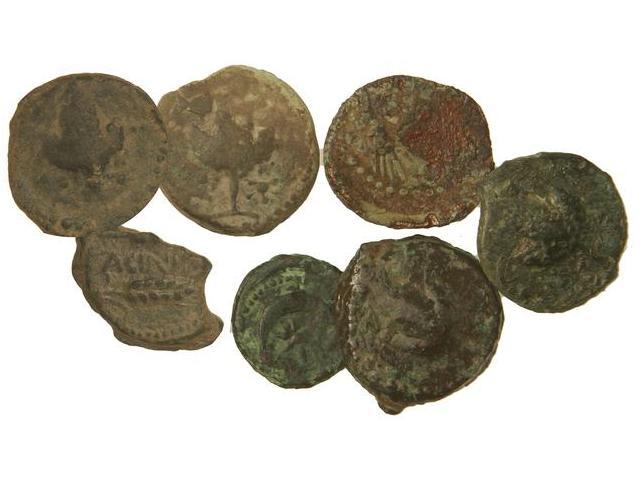 Lote 7 monedas 6 Ases y AE 17. ACINIPO (6) y NUMIDIA-FENICIA. (Una barnizada, otra cospel irregular). A EXAMINAR. BC a MBC-.