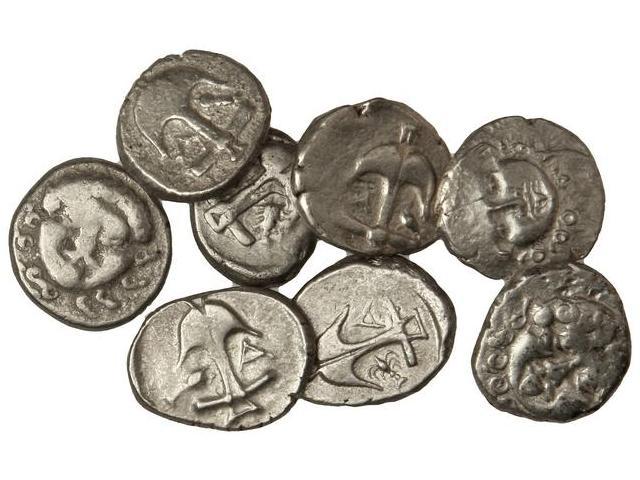 Lote 8 Dracmas. 450-400 a.C. APOLLONIA PONTICA. TRACIA. Anv.: Medusa. Rev.: Ancla. AR. A EXAMINAR. Se-160. BC+ a MBC.