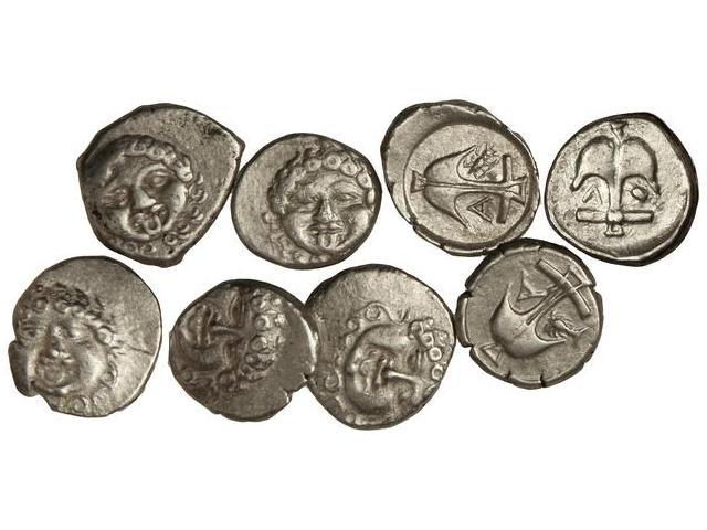 Lote 8 Dracmas. 450-400 a.C. APOLLONIA PONTICA. TRACIA. Anv.: Medusa. Rev.: Ancla. AR. A EXAMINAR. Se-160. MBC- a MBC+.