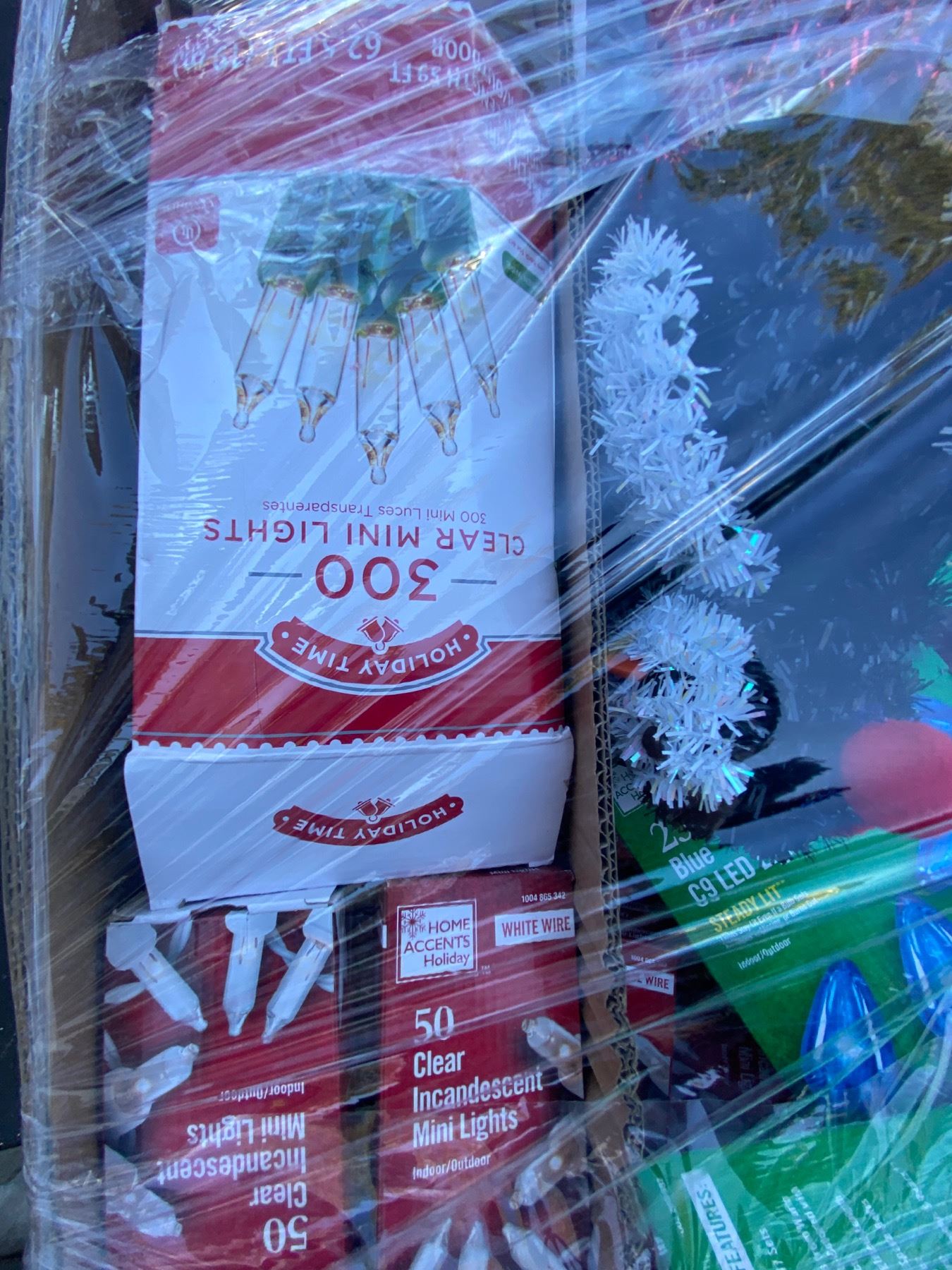 Pallet de luces navideñas de Home Depot. Todos los productos que pertenecen a este pallet son clasificados como retornos, liquidaciones y sobrecargos.