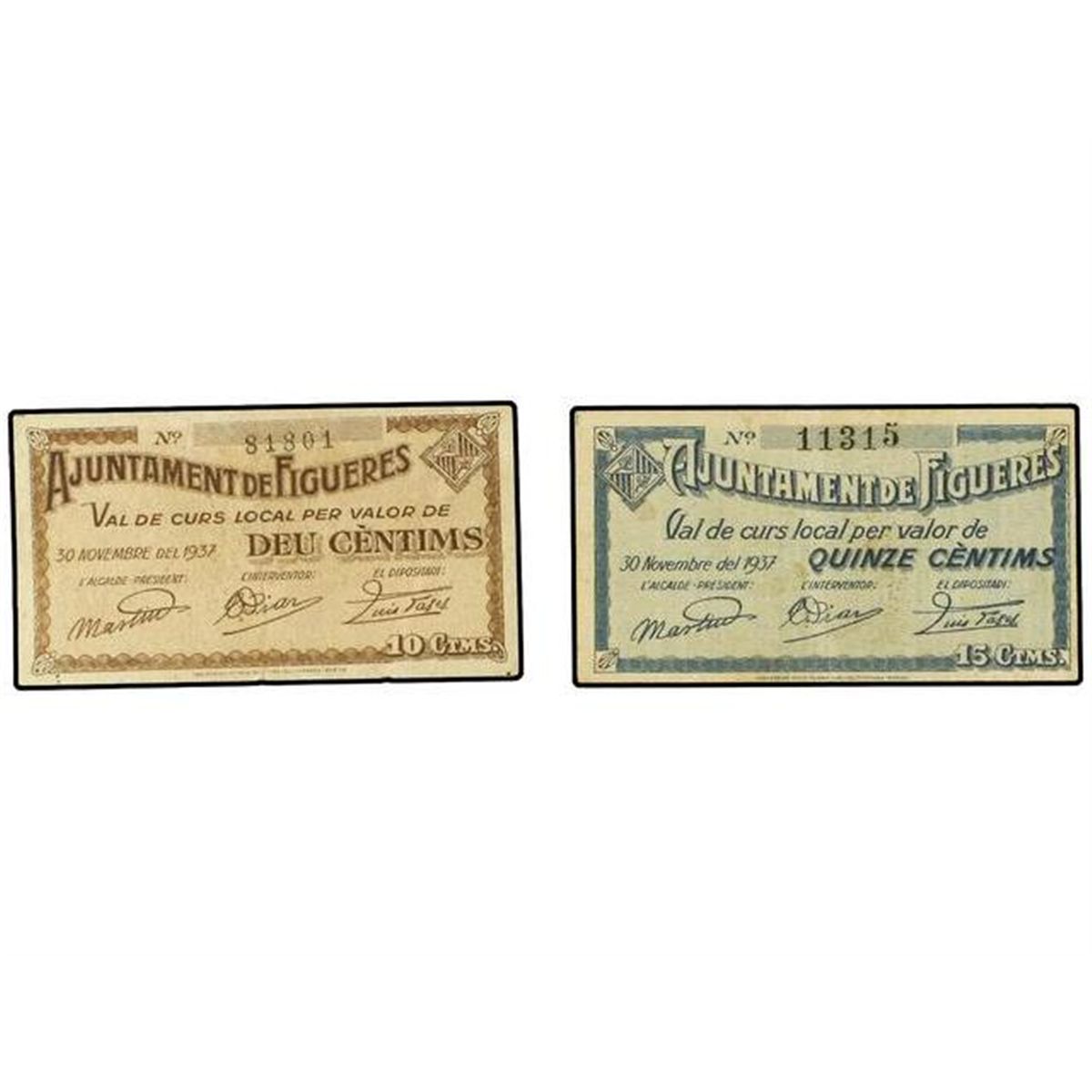 Lote de 2 billetes de 10 i 15 Cèntims. - Ay. de FIGUERAS. - AT-1008/09; T-1283/84. MBC+/EBC. - -