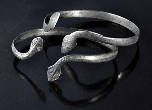 Lote dos brazaletes planos. Siglo I-III d.C. Plata. Los extremos abiertos están decorados en forma de cabeza de serpiente. Posiblemente sean de las provincias romanas del Danubio. Diámetro 5,8 y 6,0 cm.