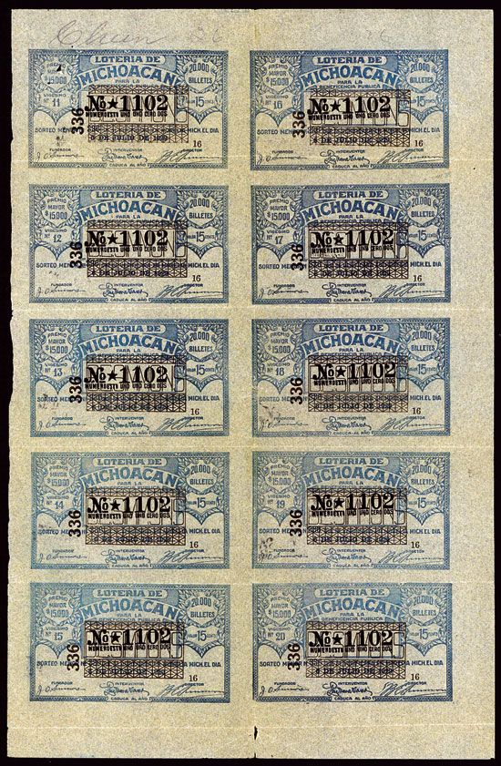 Mexico, 1929, Uncut sheet of 15 cent lottery tickets, Loteria de Michoacan para la Beneficencia Publica, Blue print with black overprints, VF condition.