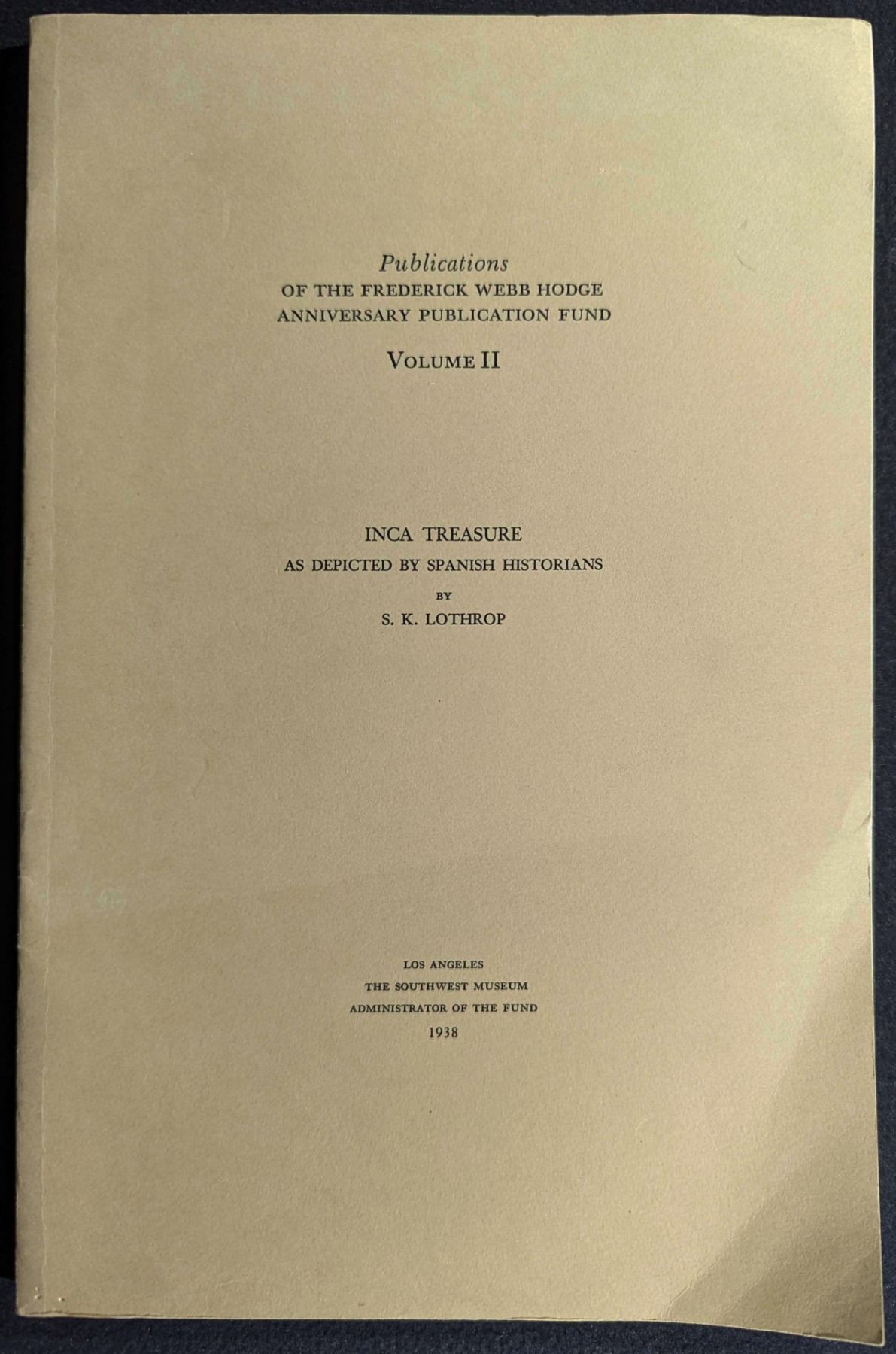 Lothrop, S.K. INCA TREASURE AS DEPICTED BY SPANISH HISTORIANS. Southwest Museum Los Angeles. 1964. 8vo. vii, (3), 75, (11) pages. Los Angeles. reprint of the 1938 first edition. original tan printed card covers. illustrated. 5 b&w artifact plates. bibliography. Fine. Publications of the Frederick Webb Hodge Anniversary Publication Fund Volume II. This book is an scholarly monograph on Incan treasure as depicted by Spanish historians. The monograph covers primitive history of Peru: peoples of the mountains, peoples of the coast; metallurgy: mining and methods of manufacture; Inca opulence as seen by the Spaniards: sources of wealth, accumulation of wealth, palaces, personal possessions, temples and convents, and festivals; Spanish loot: loot of the north coast, capture and ransom of Atahualpa, what the Spaniards missed, additional loot from northern Peru, the march to Cuzco, the loot of Cuzco, and other spoils of war; buried treasure; and weights and measures. Lot weight: 0 lbs 7oz. Subject(s): Buried Treasure.