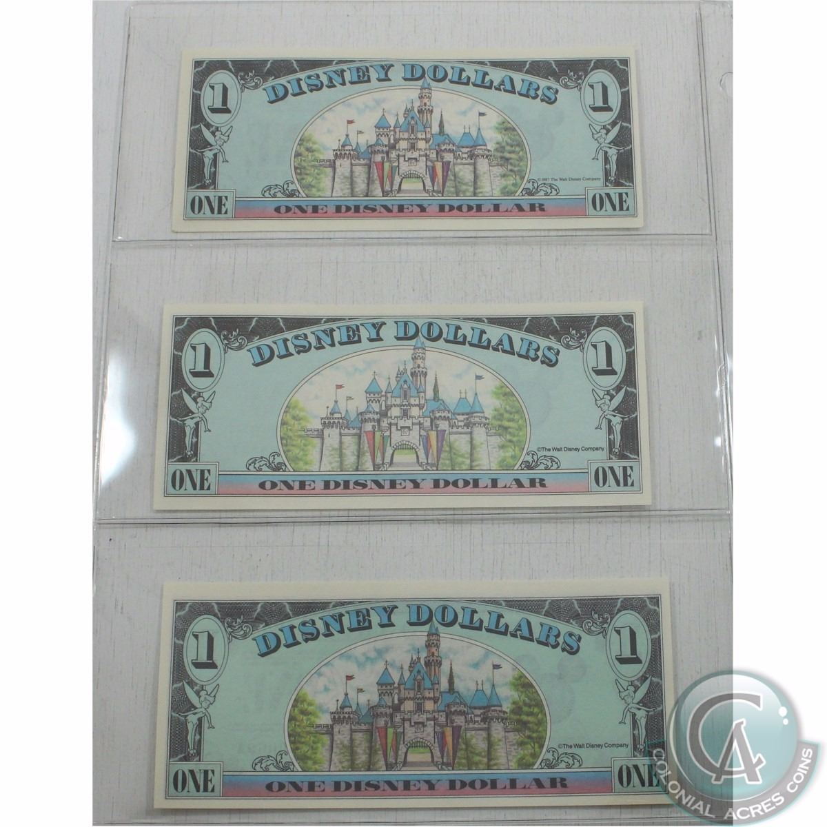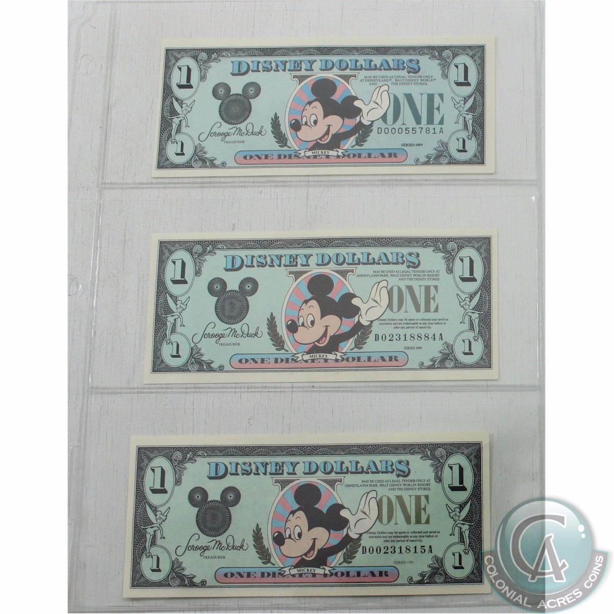 Lots of 3x 1989, 1990 and 1991 Disney Dollar Notes in Uncirculated Condition (3pcs)