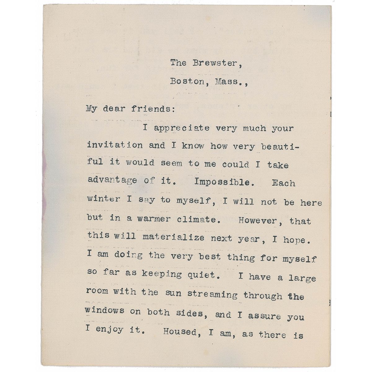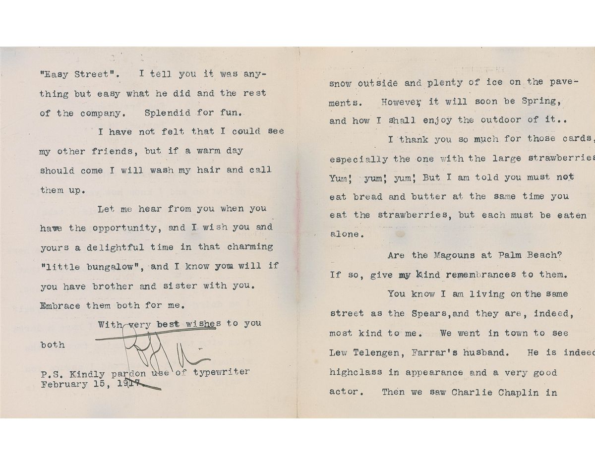 Broadway star (1847–1924) who spent much of her youth dancing on stage for miners in the California Gold Rush, eventually becoming the protegee of actress Lola Montez. TLS signed “Lotta,” three pages on two adjoining sheets, 5 x 6.5, February 15, 1917. Letter to friends. In part: “Each winter I say to myself, I will not be here but in a warmer climate. However, that this will materialize next year, I hope…thank you so much for those cards, especially the one with the large strawberries. Yum! Yum! Yum! But I am told you must not eat bread and butter at the same time you eat the strawberries, but each must be eaten alone…We went in town to see Lew Telengen [sic], Farrar’s husband. He is indeed highclass [sic] in appearance and a very good actor. Then we saw Charlie Chaplin in ‘Easy Street.’ I tell you it was anything but easy what he did and the rest of the company. Splendid for fun.” In fine condition, with a few mild areas of soiling and damp staining.
