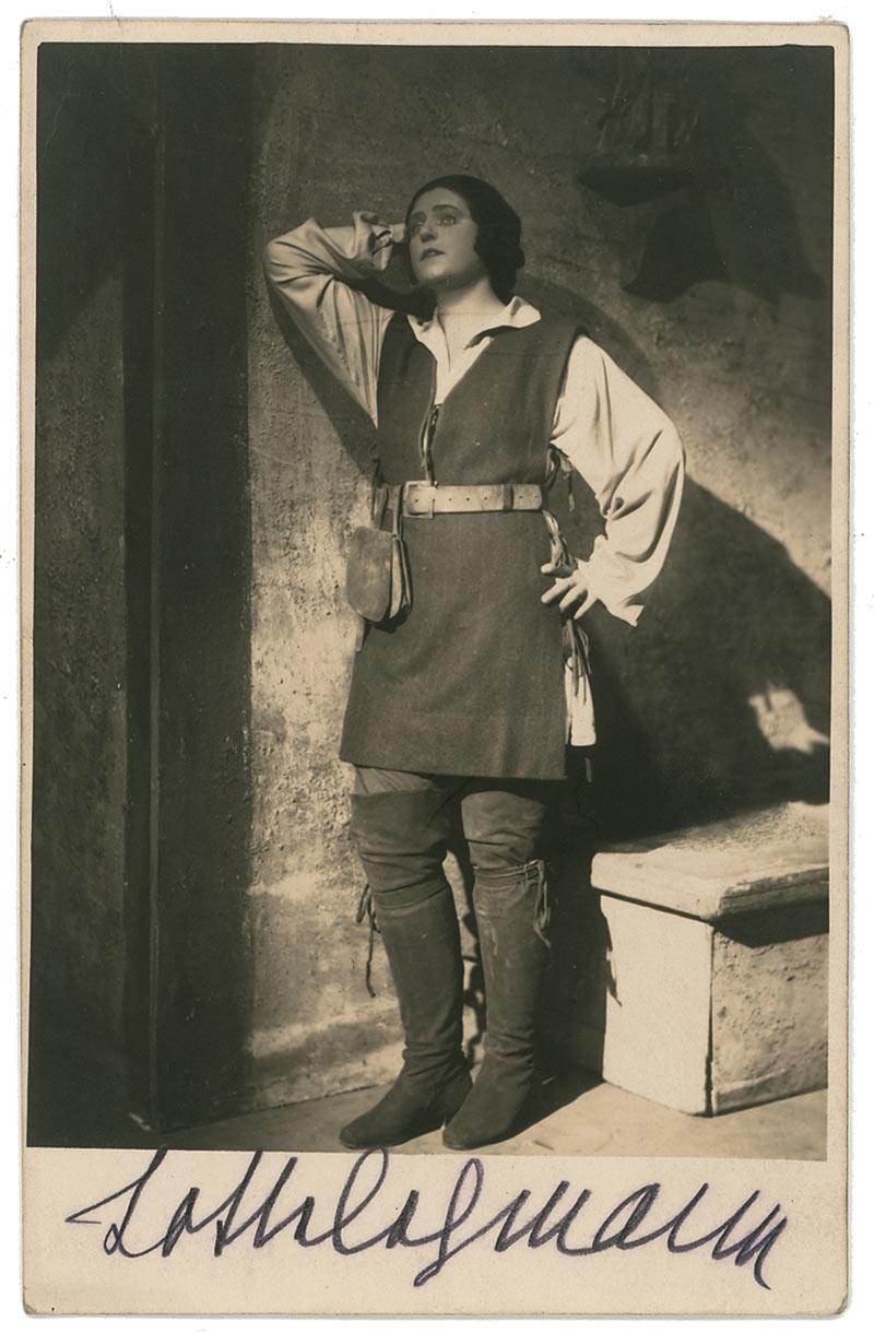 Vintage 3.5 x 5.25 postcard photo of Lehmann in costume, signed in the lower border in pencil. In fine condition, with a couple small corner creases, a bit of light silvering to darker areas, and some light soiling to lower border.