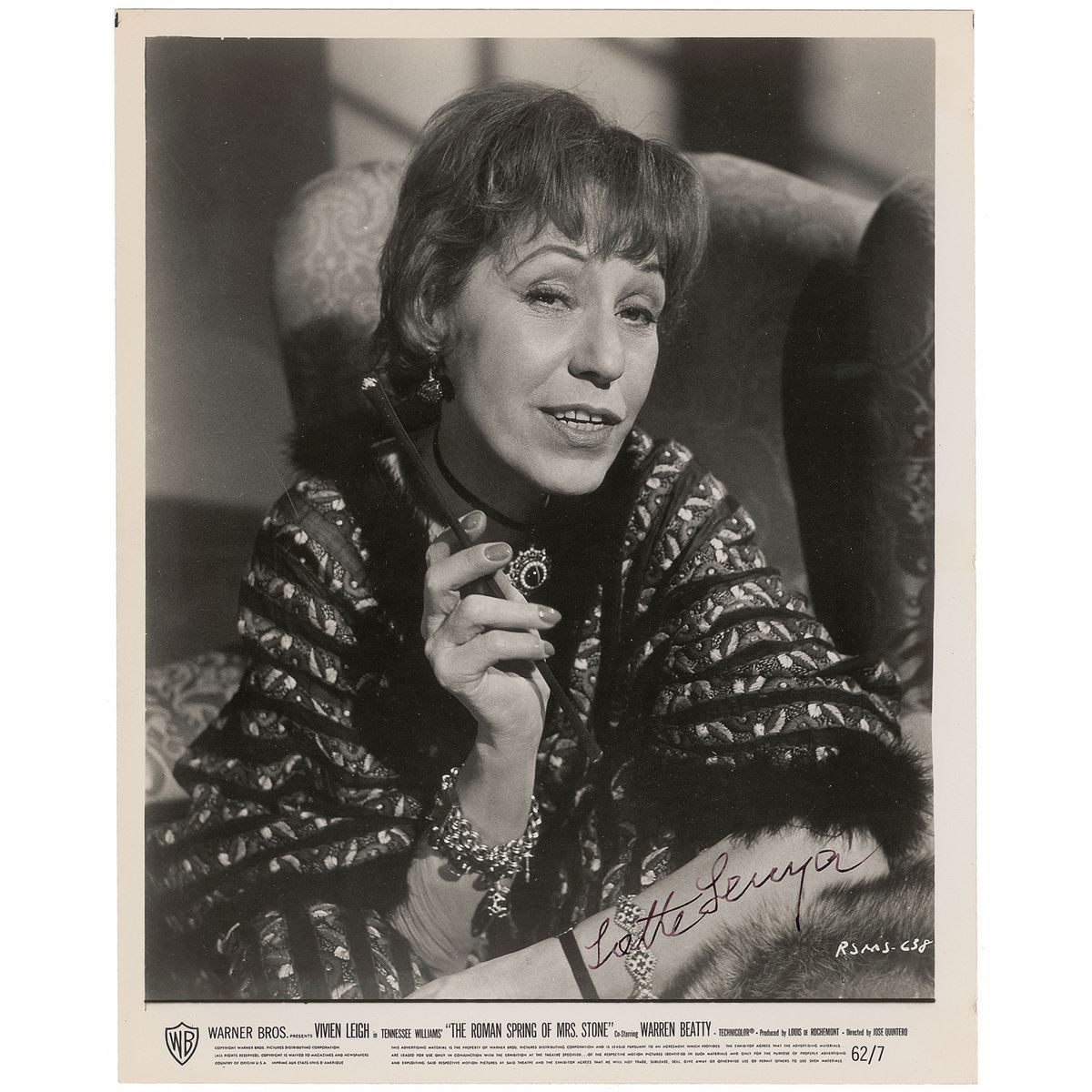 Austrian singer and actress (1898–1981) who is best remembered for her performances of the songs of her husband, the German composer Kurt Weill. Glossy 8 x 10 Warner Bros. publicity photo of Lenya as Contessa Magda Terribili-Gonzales from the 1961 film The Roman Spring of Mrs. Stone, signed along her forearm in black ink. In fine condition, with trivial dings to right edge and a crease to lower left corner.