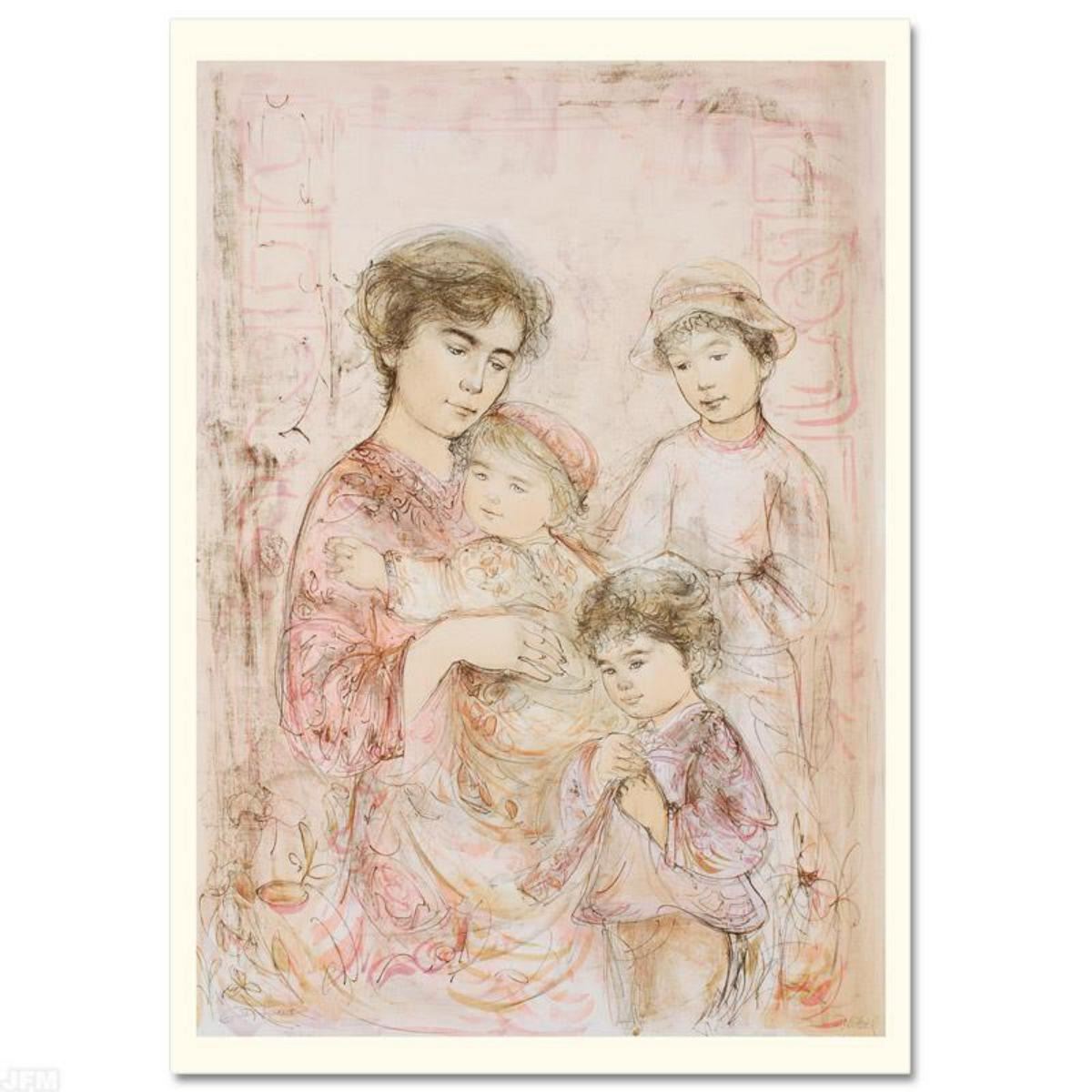 Wild lines and muted colors make Edna Hibel's art stand out in any room. "Lotte and Her Children" is a limited edition lithograph on paper, numbered and hand signed by Hibel. Includes Certificate of Authenticity! Measures approx. 30" x 41.5" (with border), 27" x 37" (image). Reference #: 178541.