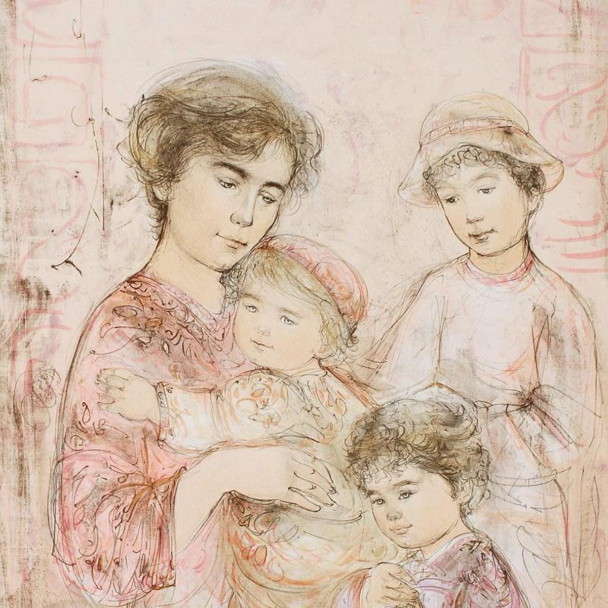 Wild lines and muted colors make Edna Hibel's art stand out in any room. "Lotte and Her Children" is a limited edition lithograph on paper, numbered and hand signed by Hibel. Includes Certificate of Authenticity! Measures approx. 30" x 41.5" (with border), 27" x 37" (image). Reference #: 178541.
