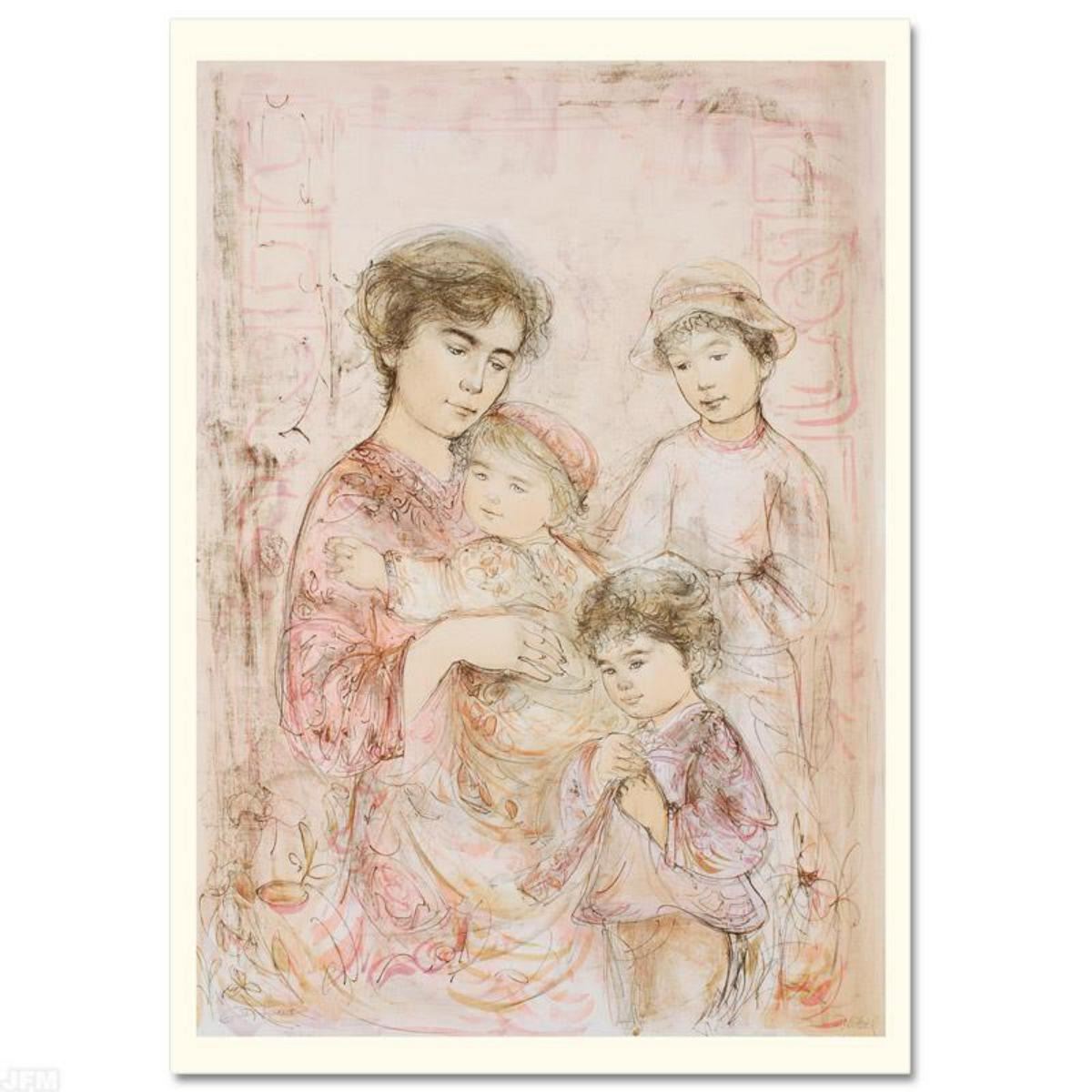 Wild lines and muted colors make Edna Hibel's art stand out in any room. "Lotte and Her Children" is a limited edition lithograph on paper, numbered and hand signed by Hibel. Includes Certificate of Authenticity! Measures approx. 30" x 41.5" (with border), 27" x 37" (image). Reference #: 178541.