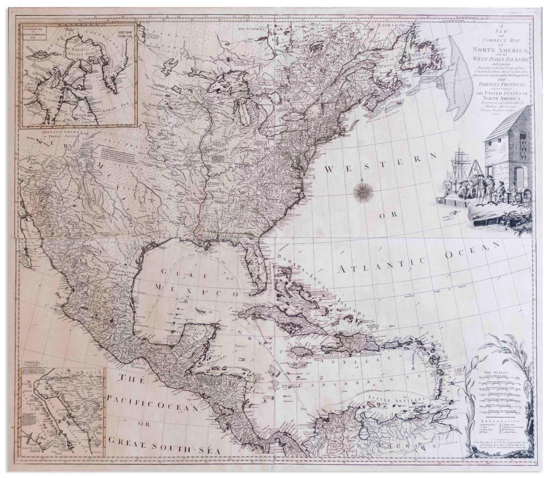 Large four-sheet engraved map measuring nearly 4' x 3.5' showing North America in 1784, with sovereignty of the thirteen colonies belonging to the United States following the Treaty of Paris that concluded the Revolutionary War. Published in Ausburg, Germany by Mathew Albert Lotter and Georg Frederic Lotter, 1784. Map is titled at upper right, ''A new and correct map of North America with the West India Islands. Divided according to the last Treaty of Peace, concluded at Paris the 20th of Jan. 1783. wherein are particularly distinguished the Thirteen Provinces wich [sic] compose the United States of North America''. A cartouche underneath shows tradesmen and workers on the banks of Bermuda, and two insets show Baffin and Hudson's Bay beneath the Arctic, and land bordering the ''Sea of California'' partially described as ''The Passage by Land to California''. Map measures 46.875'' x 41''. Professionally backed to linen and lightly mounted to board. Minute foxing and a few spots of repair. Overall very good to near fine condition given age including superior color contrast. With fascinating detail, map would anchor a room and serve as an excellent topic of ongoing reflection and discussion.