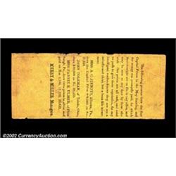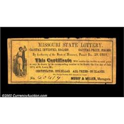Lottery Ticket - Missouri State Lottery, 1874. A certificate from the 1874 Missouri State Lottery, printed on yellow paper with a vignette of Justice at left. Important notice: We expect to be auctioning lots at the rate of 200-250 per hour. Sometimes eBay Premier live bid software cannot keep up with that pace, so we strongly recommend that you place a realistic proxy bid now as insurance to avoid disappointment. Also please note that all Heritage/CAA lots purchased through eBay Premier carry a 20% Buyer's Premium. Please make sure you read the Terms and Conditions.