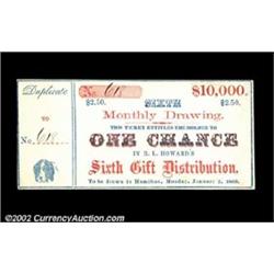 Lottery Ticket - R.L. Howard's Sixth Gift Distribution, 1860. A certificate for a $10,000 monthly drawing, dated at Hamilton, Jan. 2, 1860. A small vignette of a dog's head appears at the bottom left corner. Important notice: We expect to be auctioning lots at the rate of 200-250 per hour. Sometimes eBay Premier live bid software cannot keep up with that pace, so we strongly recommend that you place a realistic proxy bid now as insurance to avoid disappointment. Also please note that all Heritage/CAA lots purchased through eBay Premier carry a 20% Buyer's Premium. Please make sure you read the Terms and Conditions.