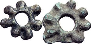 Lotti classici. I Celti. Lotto di 2 monete ad anello con globetti, II-I secolo a.C. AE. Diametro 32mm.; 24mm. Peso: gr. 15.18; gr. 7.01. BB.