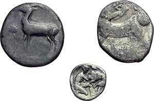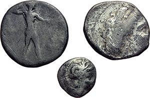 Lotti classici. Italia Greca. Italia greca. Lotto di 3 nominali d'argento da classificare. AG. Due didracme e un diobolo. qBB:BB.