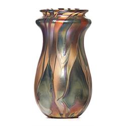 Lotton vase, gourd form in iridescent gold glass with thick pulled leaf designs, incised signature, dated 1991, 6.5”h