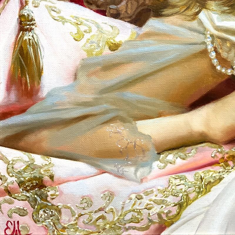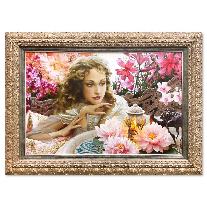 "Lotus Flower" is an original oil painting on canvas by Katya Morgun, hand signed by the artist. This piece comes framed. Includes Letter of Authenticity. Measures approx. 42" x 58" (frame), 30" x 46" (image). There is some where on the frame.