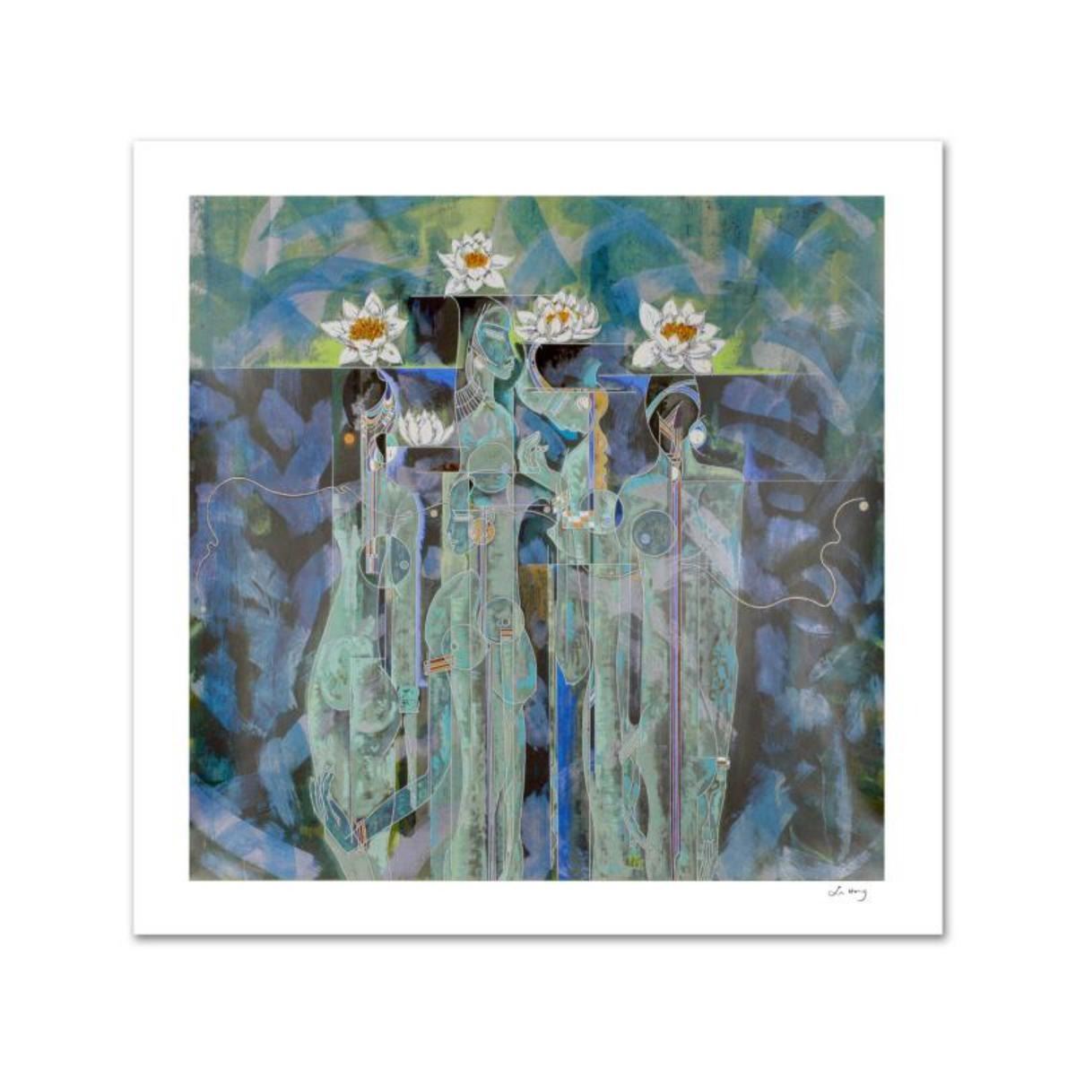 Lu Hong's work, collected worldwide, is often characterized by the use of vibrant colors and emotive lines. "Lotus" is a limited edition serigraph on paper, numbered and hand signed by the artist. Includes Certificate of Authenticity! Measures approx. 38" x 38" (with border), 33" x 32.5" (image). Reference #: 168289.