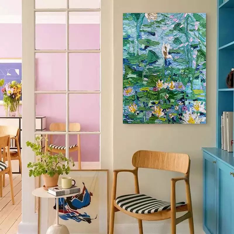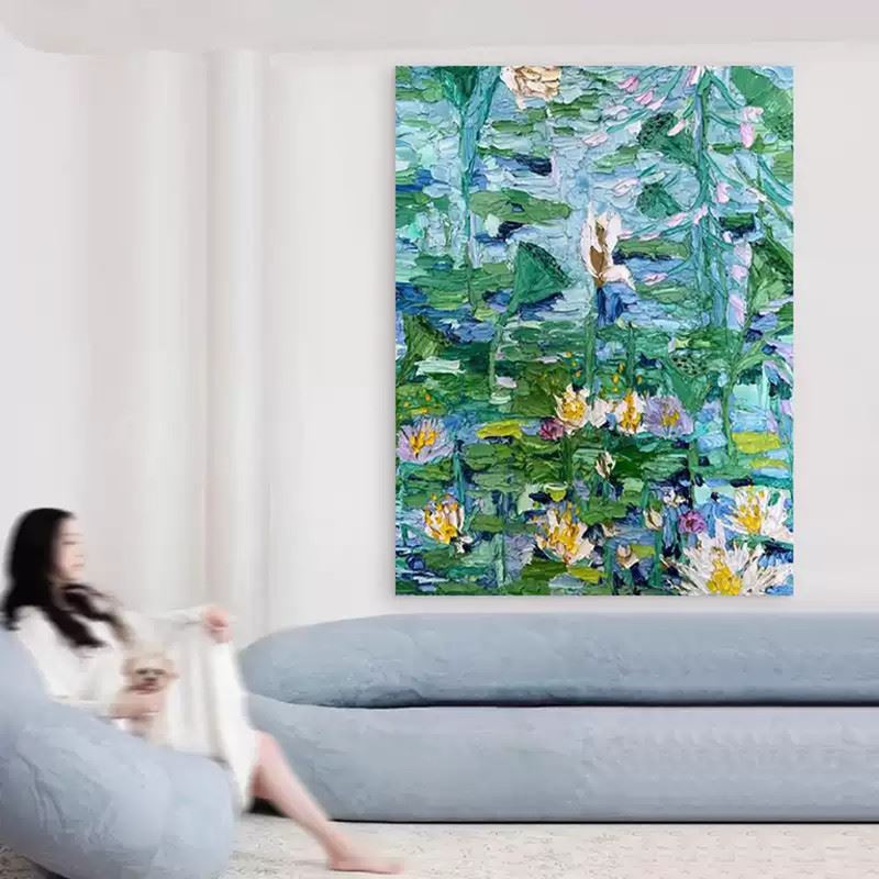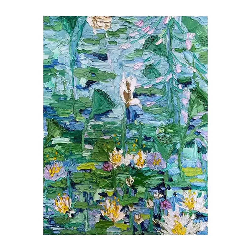 In the pond, green lotus leaves surround the water, where blooming lotus flowers float, each whispering the warmth of summer. The water acts as a mirror, reflecting the delicate flowers and leaves, blending the fresh greens with the soft shadows of blossoms, creating a tranquil watercolor scene. Dimensions: 24 x 31 inches.