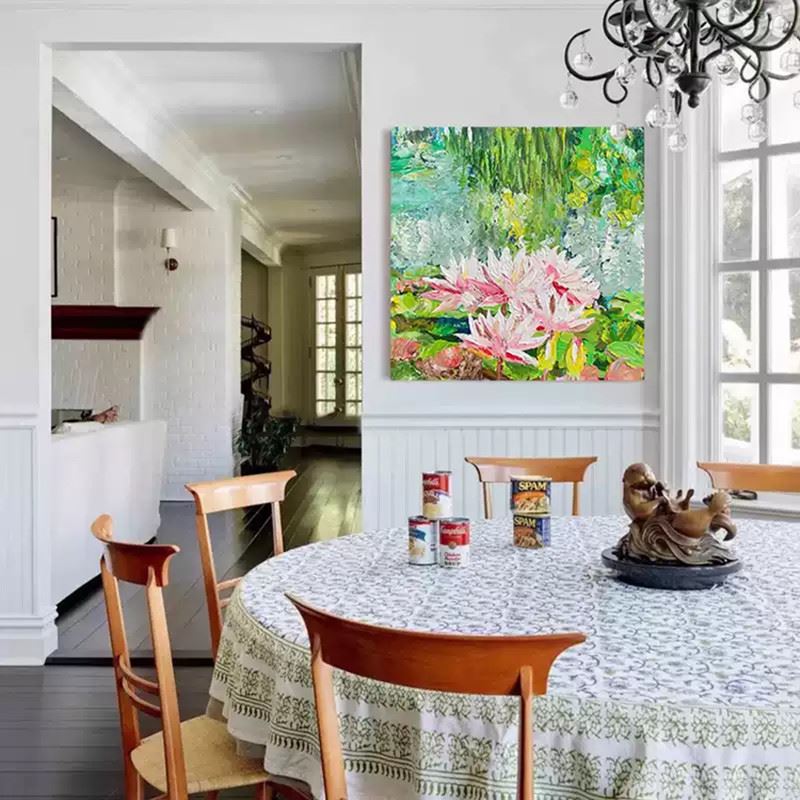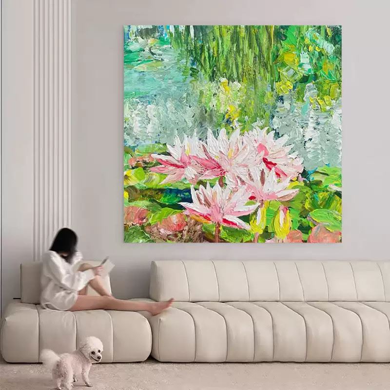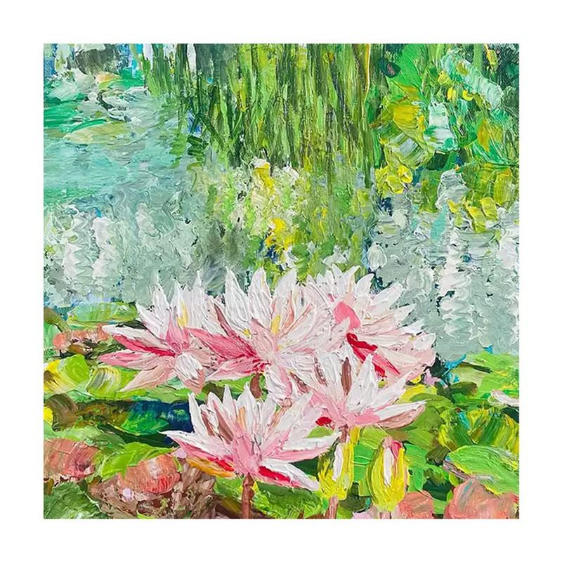 Soft pink lotuses bloom gracefully against the green water and lush foliage, as if emerging from a dream. Rippling reflections and overhanging leaves intertwine, creating a tranquil and romantic summer lotus pond. Dimensions: 24 x 24 inches.