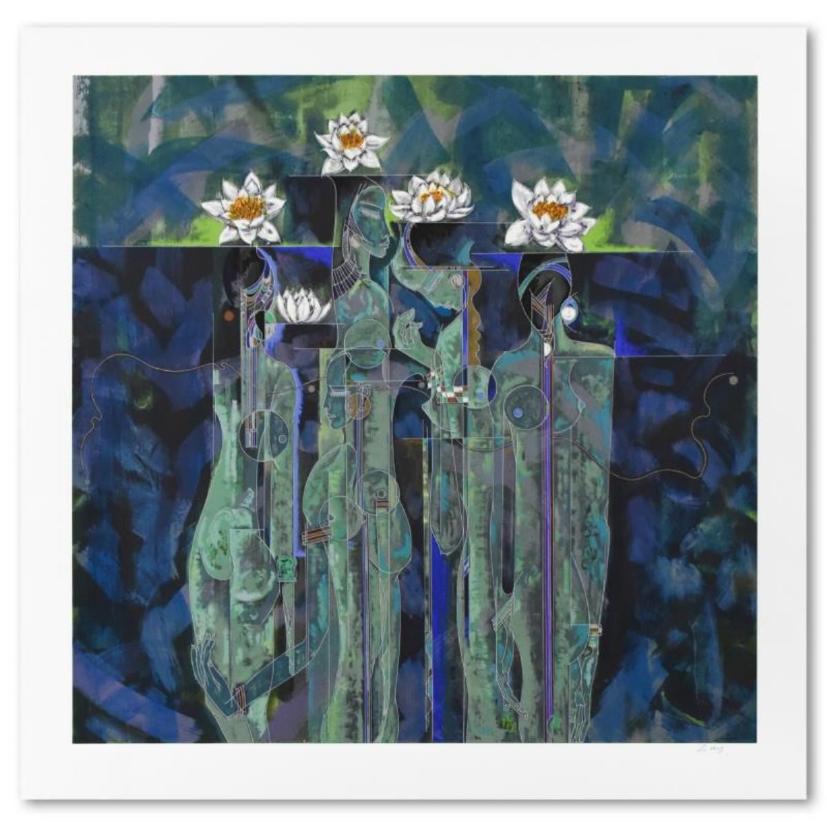 "Lotus" is a limited edition serigraph on paper by Lu Hong, numbered and hand signed by the artist. Includes Letter of Authenticity. Measures approx. 38" x 37.5" (with border), 33" x 32" (image).