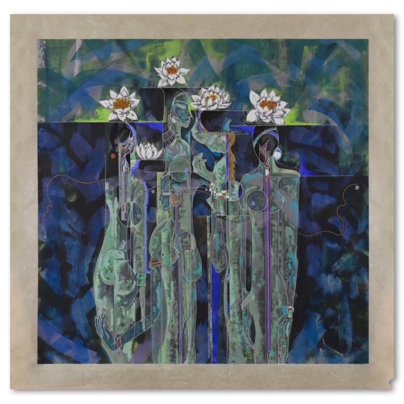"Lotus" is a limited edition serigraph on rice paper by Lu Hong, numbered and hand signed by the artist. Includes Letter of Authenticity. Measures approx. 38.5" x 37.5" (with border), 33" x 32" (image).