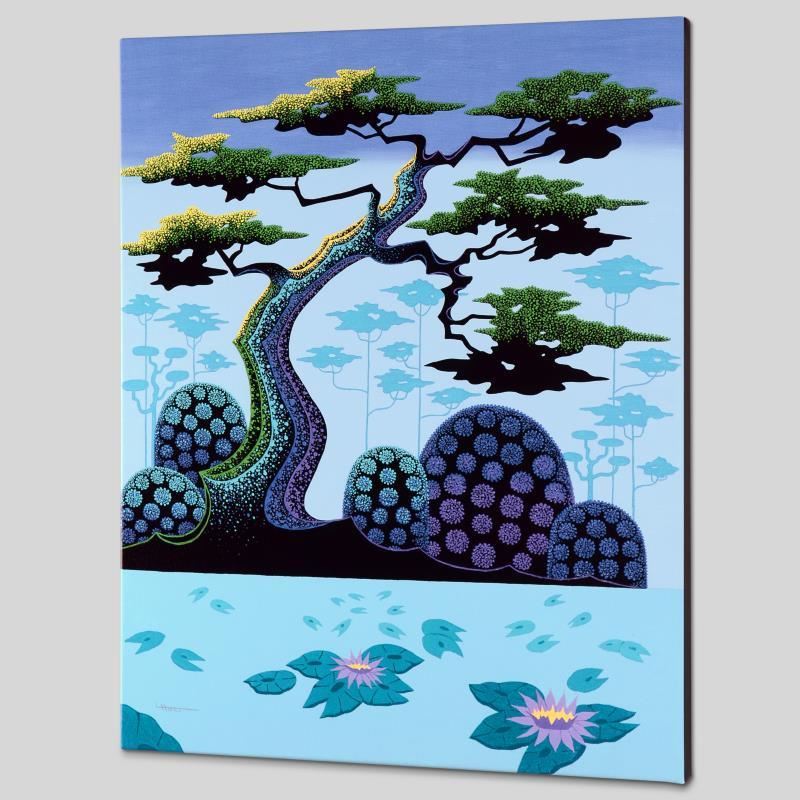 Larissa Holt, a student of distinguished artist Eyvind Earle (1916-2000), uses bold colors and breathtaking scenery to create images of Nature in her own unique style. "Lotus by Moonlight" is a limited edition giclee on stretched canvas by Holt, numbered and bearing Holt's authorized signature. This piece comes gallery wrapped. Includes Letter of Authenticity. Measures approx. 21.5" x 27" x 1.5" (image). This item requires special handling and may have a longer than usual turnaround.