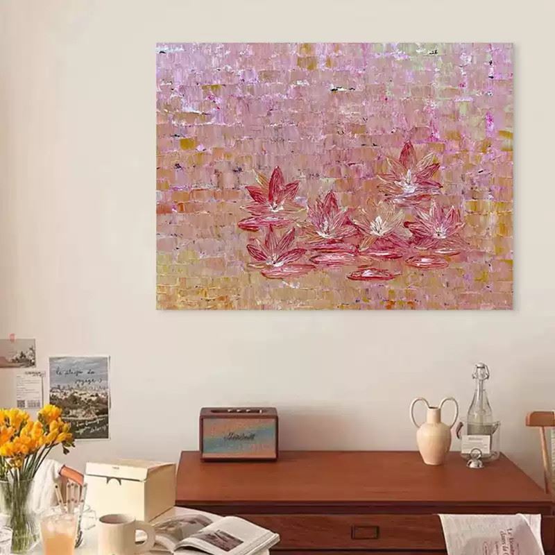Delicate pink-gold tiles spread across the canvas like sunset glow on water, while soft red lotuses quietly bloom within, graceful and serene. The warm palette bathes the scene in a gentle halo, evoking a twilight lotus pond softly breathing in the fading light. Dimensions: 31 x 24 inches.