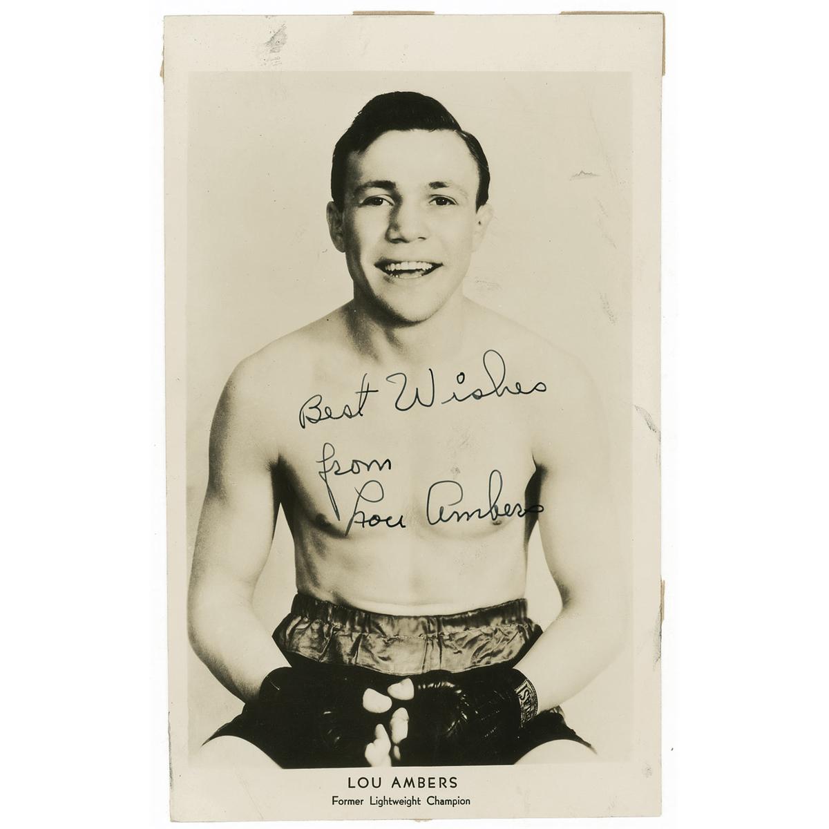 Former lightweight champion of the world. Vintage glossy 5 x 8 photo of Ambers in his boxing gear, signed in fountain pen. In very good condition, with scattered creases and surface marks, a bit of light silvering to darker areas, and mounting remnants to reverse.